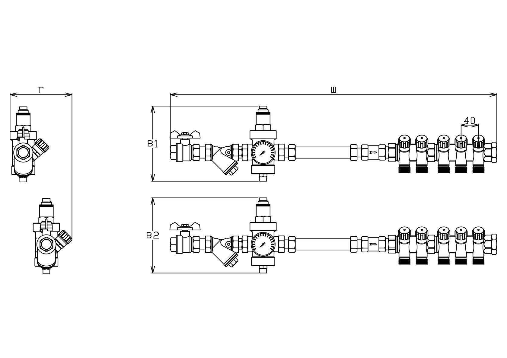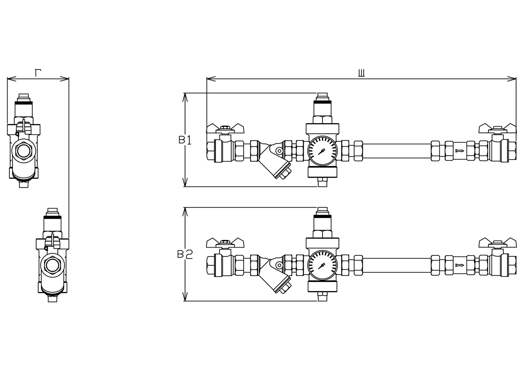 множество конфигураций, которые зависят от расчетного расхода воды потребителя, размера пространства для установки узлов и необходимых функциональных возможностей.
